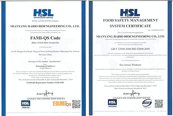 Mianyang Habio Bioengineering Co., Ltd. have got FAMI-QS Code(Date:14 Feb 2014,Version:5.1)and FOOD SAFETY MANAGEMENT SYSTEM CERTIFICATE(GB/T22000-2006/ISO22000:2005)from HSL CERTIFICATION SERVICE.