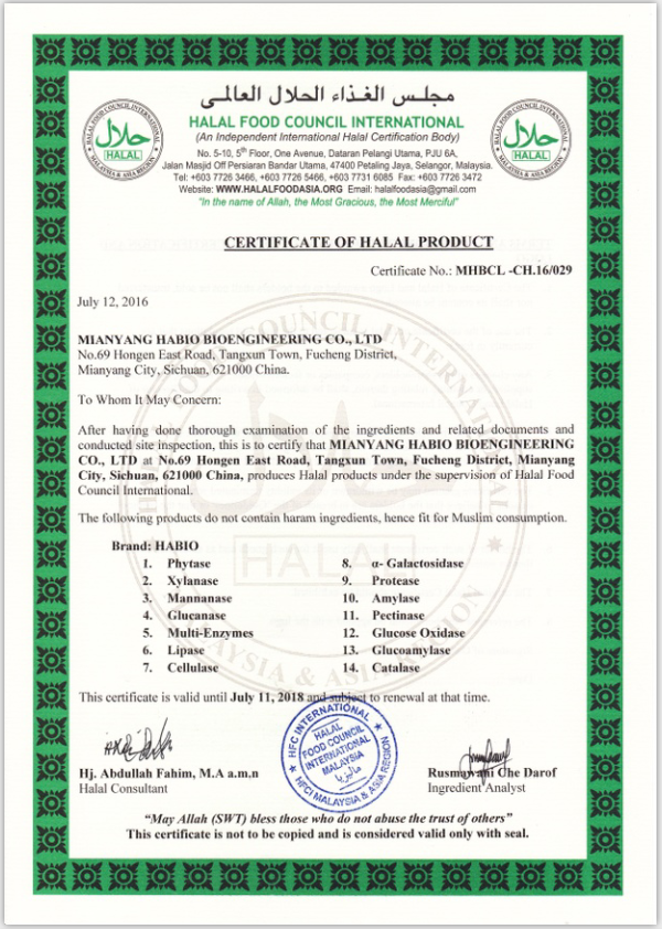 Mianyang Habio Bioengineering Co., Ltd. have got CERTIFICATE OF HALAL PRODUCT (Certificate No.: MHBCL-CH.16/029) from HalalFoodCouncilInternational.